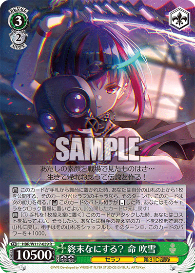 【自】此牌從手牌放置到舞台時,公開你牌庫頂的1張牌。若該牌為《セラフ》角色的話,該回合中,此牌獲得以下能力。『【自】此牌的戰鬥對手【倒置】時,你可以將該角色放置到計時區。』(將公開的牌放回原位)